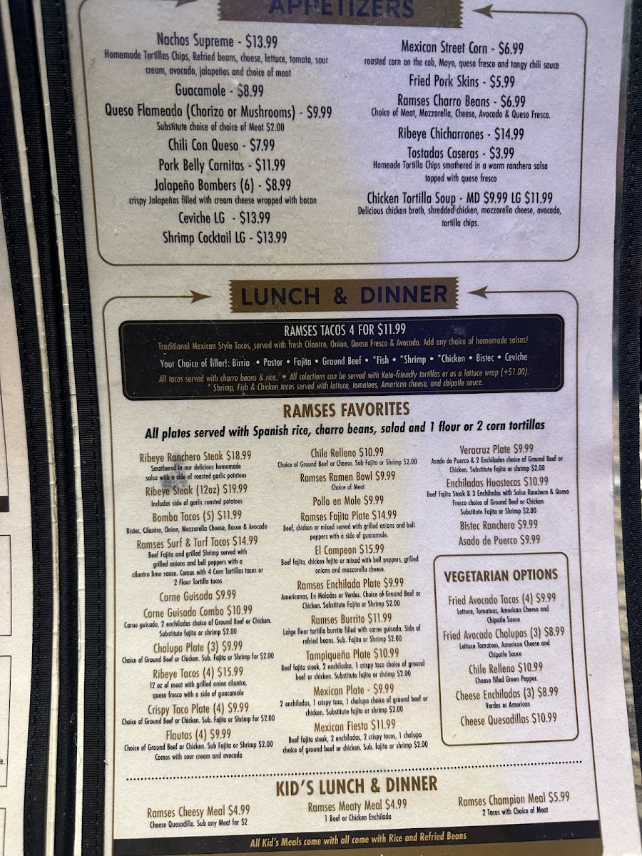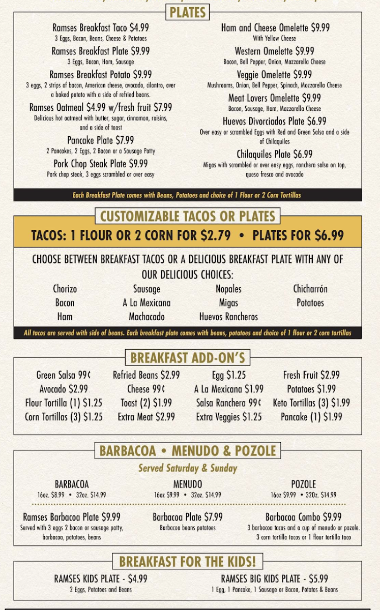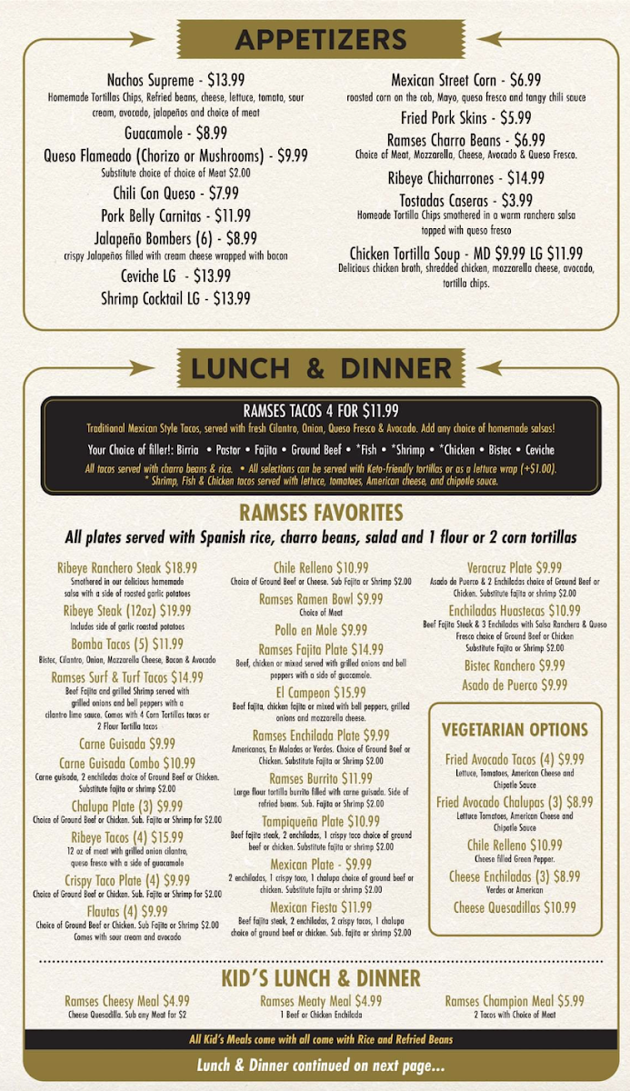 If you're in the mood for delicious tacos paired with a great selection of tequila, look no further than Ramses Tacos & Tequila Menu. Located at 2230 S 77 Sunshine Strip in Harlingen, Texas, this spot offers a mouth-watering variety of flavorful tacos, from the classic to the bold and adventurous. Each taco is crafted with fresh ingredients and seasoned to perfection, ensuring a satisfying bite every time. The menu features everything from traditional favorites to unique creations that will surprise your taste buds. Whether you're craving a light snack or a full meal, Ramses Tacos & Tequila has something for everyone. And of course, their wide range of tequilas is the perfect complement to any taco, making it the ideal place for a relaxed night out with friends. Whether you're new to Mexican cuisine or a seasoned taco lover, the experience at Ramses will surely leave you coming back for more.
